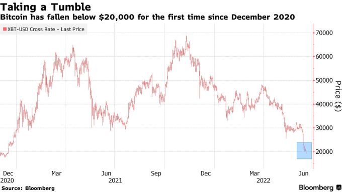 Lần đầu tiên kể từ tháng 12/2020, Bitcoin xuống dưới 20.000 USD khi nhà đầu tư tiếp tục tháo chạy khỏi các tài sản rủi ro.